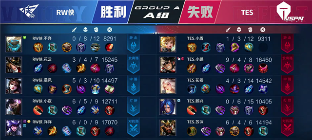 双方和平开局。1分50秒上路团战,兰陵王拿下一血,双方1换1.。2分30秒橘右京拿下主宰。3分30秒橘右京被击杀。4分钟下路团战,双方1换1。4分47秒马可波罗拿下暴君。5分19秒马超推掉上路一塔。5分30秒中路团战,双方1换1。6分10秒马可波罗推掉下路一塔。6分40秒RW侠拿下主宰。7分钟中路团战,双方1换1。7分35秒上河道团战,RW侠打出0换3。7分55秒RW侠推掉中路一塔。8分40秒马超推掉上路二塔。10分15秒下河道团战,TES打出0换3。10分30秒蒙犽推掉下路一塔。10分55秒TES拿下暴君。12分钟中路团战,双方打出2换2,兰陵王拿下双杀。12分55秒TES下路二塔被破。13分50秒橘右京拿下主宰,团战TES打出2换3,蒙犽拿下双杀。15分15秒暴君团,TES打出2换3,马超拿下双杀。16分30秒橘右京拿下暴君。18分15秒橘右京拿下主宰。20分30秒龙王团,RW侠打出3换5,兰陵王拿下风暴龙王。RW侠顺势下路一波直上高地,21分38秒RW侠攻破水晶拿下本场比赛胜利。