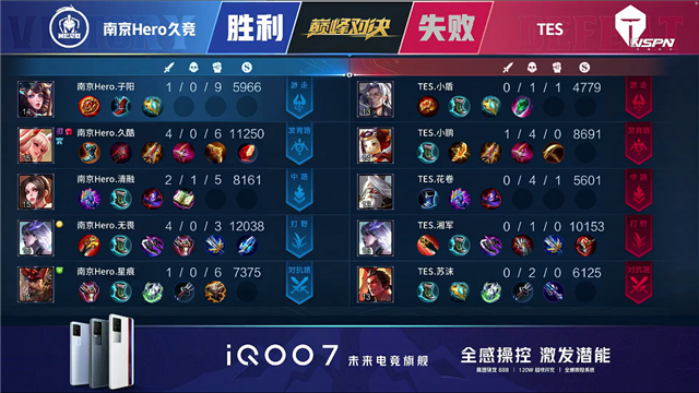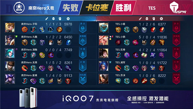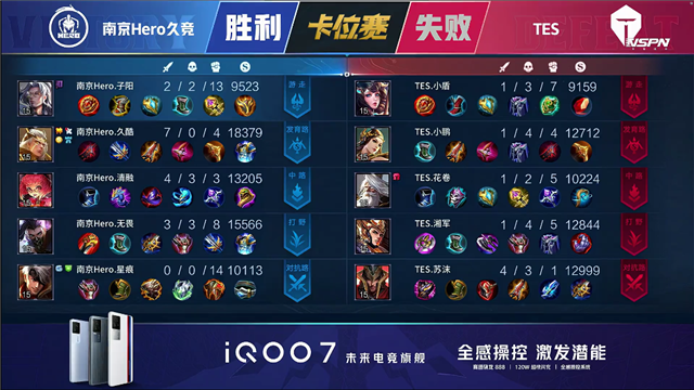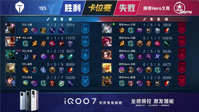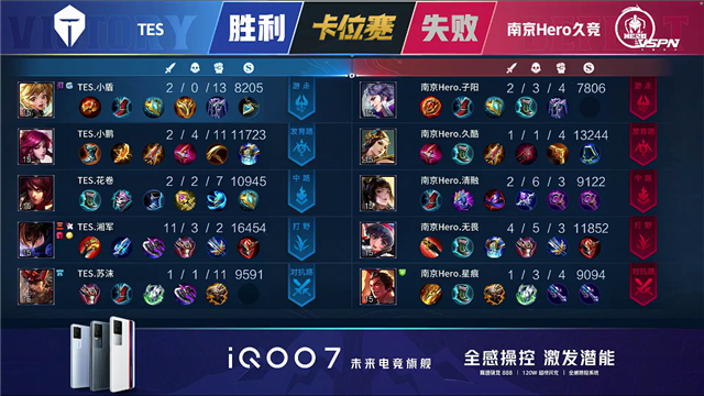 开局南京Hero如前TES入侵反下蓝Buff,1分07秒南京Hero沈梦溪击杀太乙真人拿下一血,双方1换1。2分37秒中路团南京Hero打出2换3,5分19秒下路团TES打出2换3,6分11秒TES下路一塔被破。6分55秒南京Hero拆掉TES上路一塔,7分20秒上路团双方1换1。9分45秒TES上下路二塔被破,10分20秒团战南京Hero打出0换2,拆掉TES中路二塔。11分20秒南京Hero拿下暗影暴君,12分钟南京Hero拿下暗影主宰,12分50秒南京Hero拆掉TES上路高地。14分07秒南京Hero拆掉TES下路高地,15分08秒TES击杀廉颇,16分钟南京Hero拿下暗影暴君。17分19秒南京Hero拆掉TES中路高地,团战TES打出2换3。19分32秒团战TES打出0换2,20分20秒TES拿下风暴龙王。21分钟TES成都南京Hero中路二塔,23分10秒南京Hero击杀蒙犽。25分50秒团战南京Hero拿下风暴龙王,团战打出0换3,一波拆掉TES水晶。