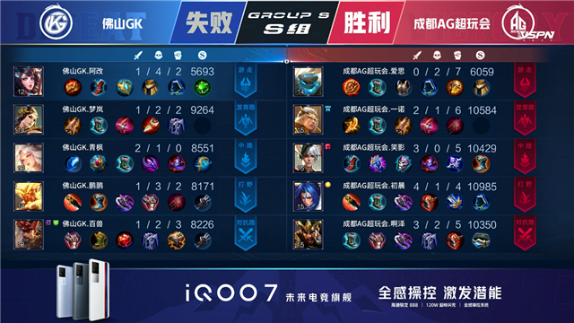 双方平稳开局。2分16秒佛山GK拿下主宰,成都AG拿下暴君。2分37秒佛山GK下路打出1换2。4分13秒佛山GK摧毁敌方上路外塔。5分01秒佛山GK上路击杀橘右京,成都AG摧毁敌方中路外塔。6分09秒成都AG摧毁敌方下路外塔。6分36秒成都AG拿下主宰。6分51秒佛山GK拿下暴君。7分05秒下路团战成都AG打出1换2。9分27秒成都AG摧毁敌方下路二塔。9分40秒佛山GK摧毁敌方上路二塔。12分14秒成都AG野区打出0换2。12分37秒成都AG拿下暗影暴君。12分43秒成都AG拿下中路二塔。12分52秒团战成都AG击杀大乔并摧毁中路高地塔。13分32秒下路团战成都AG打出2换4。13分56秒成都AG团灭对手摧毁水晶拿下比赛。