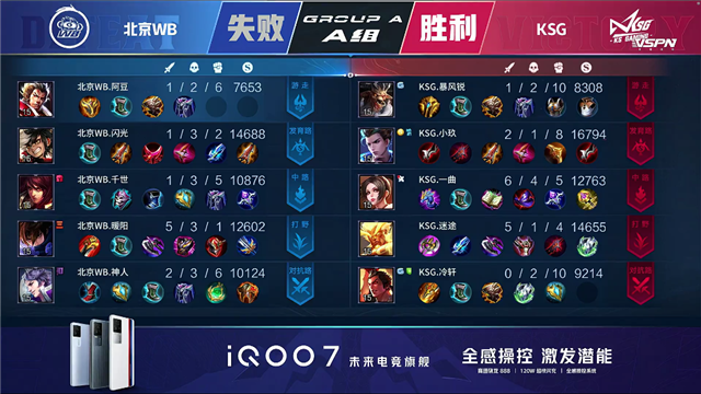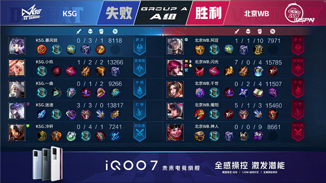 北京WB3Buff开局。47秒周瑜击杀吕布拿下一血。2分15秒北京WB抢下先知主宰,团战打出0换4,澜拿下三杀。5分钟下路团双方打出3换3,北京WB拆掉KSG下路一塔。7分44秒北京WB拿下先知主宰,拆掉KSG中路一塔,8分50秒中路团北京WB击杀不知火舞。9分05秒北京WB拆掉KSG下路二塔,9分20秒下路团KSG打出0换2。10分钟KSG拆掉北京WB中路一塔并击杀周瑜,10分23秒KSG拿下暗影暴君,11分钟KSG拿下暗影主宰。14分50秒团战KSG击杀周瑜,15分45秒KSG拿下暗影暴君,16分钟团战KSG击杀澜。17分40秒团战KSG打出0换2,18分28秒KSG击杀周瑜拆掉北京WB上路高地。18分58秒KSG拆掉北京WB中路高地,19分20秒KSG一波拆掉北京WB水晶拿下本局胜利。