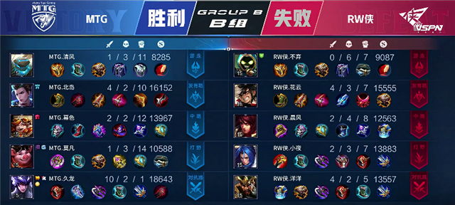 开局RW侠入侵野区,赵云拿下一血,猪八戒拿下MTG红buff。2分20秒下河道团战,西施被击杀。2分50秒下路爆发战斗,太乙真人被击杀。3分50秒赵云拿下暴君。4分20秒裴擒虎被击杀。6分13秒RW侠推掉下路一塔。6分37秒白起被击杀,RW侠推掉中路一塔。6分45秒双方团战,RW侠打出1换2。8分钟猪八戒拿下主宰。8分10秒中路团战MTG打出0换2。8分30秒MTG拿下暴君,不知火舞在上路被裴擒虎越塔击杀,西施在中路被击杀。9分50秒RW侠上路一塔被破。10分22秒MTG拿下暴君。11分45秒裴擒虎拿下主宰。12分20秒上路团战,MTG打出1换2。14分钟MTG上路二塔被破。15分钟暴君团,太乙真人被击杀,虞姬拿下暴君。15分48秒RW侠强攻中路高地塔,RW侠打出1换2。16分50秒裴擒虎拿下主宰。16分55秒上河道团战,MTG打出0换3,伽罗拿下三杀。17分40秒MTG推掉上路高地塔,MTG顺势强推高地,17分50秒攻破水晶率先拿下赛点。