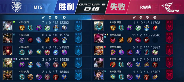 双方平稳开局。1分钟中路河道之灵团战,狄仁杰拿下一血。2分20秒橘右京拿下暴君,太乙真人被击杀。2分53秒橘右京反下蓝buff。4分40秒狄仁杰推掉下路一塔。5分43秒沈梦溪被击杀。6分钟橘右京拿下主宰。6分10秒RW侠强攻中路一塔,团战RW侠打出1换2。8分钟MTG上路一塔被破。8分47秒橘右京推掉下路一塔,狄仁杰推掉上路一塔。10分10秒中路下河道团战,盾山被击杀。11分钟暴君团,太乙真人被击杀,猪八戒拿下暴君。12分20秒RW侠上路二塔被破。12分35秒中路团战,RW侠打出0换2。13分22秒橘右京拿下主宰。14分35秒下河道团战,双方1换1。15分28秒MTG拿下暴君。15分50秒野区团战,MTG打出1换4,马超拿下双杀,MTG顺势推掉中路防御塔。16分57秒RW侠上路高地塔被破。18分钟野区团战,MTG打出0换2。19分钟MTG拿下主宰。19分30秒上路团战,RW侠打出3换4,马超和蒙犽分别拿下双杀。20分钟RW侠推掉中路一塔。21分20秒下河道团战,MTG打出0换4,马超拿下双杀。22分10秒MTG推掉水晶追回一分。