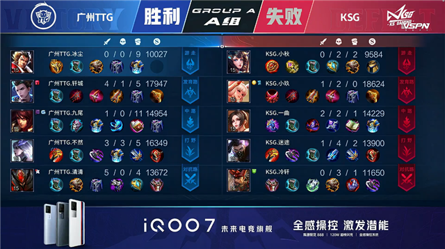 开局广州TTG反掉一组野怪。2分13秒广州TTG中路击杀太乙真人拿到一血。4分15秒广州TTG野区打出0换2。4分48秒广州TTG拿下暴君。5分52秒KSG摧毁敌方下路外塔,KSG上路击杀澜。7分47秒广州TTG摧毁敌方中路外塔。8分27秒广州TTG摧毁敌方上路二塔。8分59秒广州TTG摧毁敌方中路二塔。9分08秒广州TTG摧毁敌方下路二塔并拿下暴君。9分29秒广州TTG下路击杀太乙真人。10分14秒广州TTG拿下暗影暴君。11分25秒广州TTG摧毁敌方上路高地塔。12分20秒广州TTG下路击杀刘邦。12分59秒广州TTG摧毁敌方中路高地塔,KSG击杀不知火舞。13分46秒双方上路1换1。14分40秒广州TTG中路下河道击杀刘邦。14分53秒广州TTG拿下暗影暴君。15分27秒广州TTG摧毁敌方下路高地塔。16分26秒广州TTG拿下暗影主宰。16分47秒中路提下河道团战KSG击杀马可波罗。20分50秒广州TTG野区打出0换5,吕布拿到三连决胜。21分14秒广州TTG摧毁敌方水晶拿下比赛。