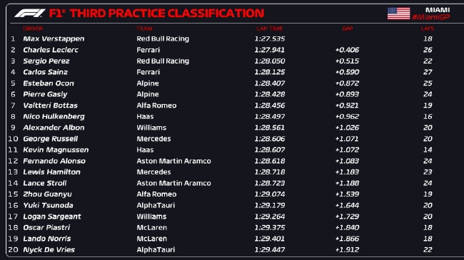 24直播网讯 2023年F1迈阿密大奖赛第3次练习赛结束,红牛车队维斯塔潘以1:27.535排名第一,法拉利车队勒克莱尔落后0.406秒排名第二,另一位红牛车手佩雷兹落后0.515秒排名第三。塞恩斯和奥康分列四五,排名六至十位的车手分别是加斯利、博塔斯、霍肯伯格、阿尔本、拉塞尔。