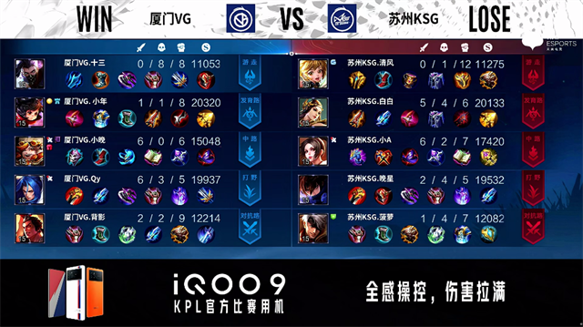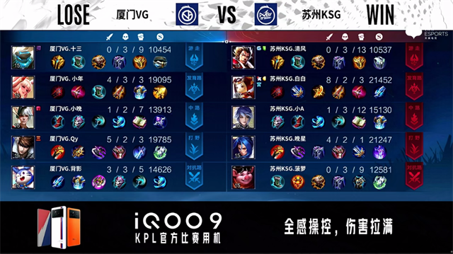 1分36秒,苏州KSG周瑜击杀暃拿下一血。3分03秒,苏州KSG拿下暴君。4分38秒,苏州KSG破掉厦门VG下一塔。5分30秒,厦门VG控下先知主宰。7分18秒,苏州KSG破掉厦门VG中一塔。7分58秒,苏州KSG控下暴君。8分57秒,苏州KSG团战打出0换2,随后破掉厦门VG中二塔。9分15秒,苏州KSG击杀孙膑,随后破掉厦门VG上高地。10分16秒,苏州KSG控下暗影主宰。10分55秒,苏州KSG破掉厦门VG下二塔。11分16秒,苏州KSG团战打出0换2并破掉厦门VG中、下高地,随后一波摧毁厦门VG水晶率先拿到赛点。