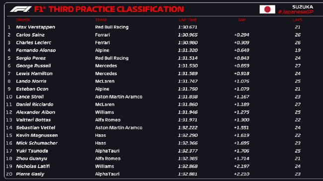 2022年F1日本大奖赛第3次练习赛成绩表: