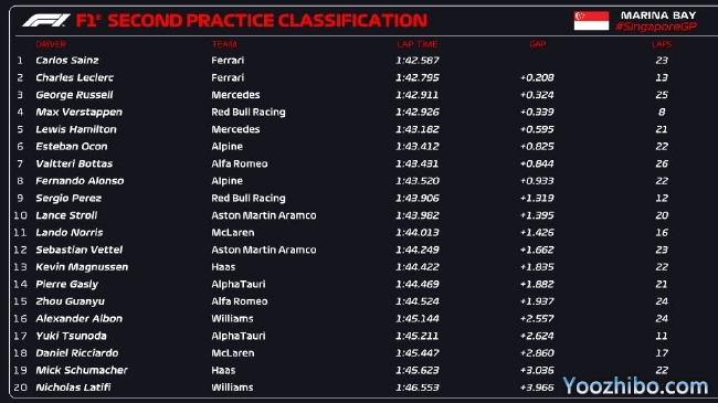 24直播网讯 2022年F1新加坡大奖赛第2次练习赛在滨海湾赛道结束,法拉利车队塞恩斯凭借1:42.587的成绩取得第一,他的队友勒克莱尔落后0.208秒位居次席。梅赛德斯车队拉塞尔和红牛车队维斯塔潘排名第三和第四。其中维斯塔潘由于赛车问题错过了二练的大部分时间,直到尾声阶段才回到赛道。