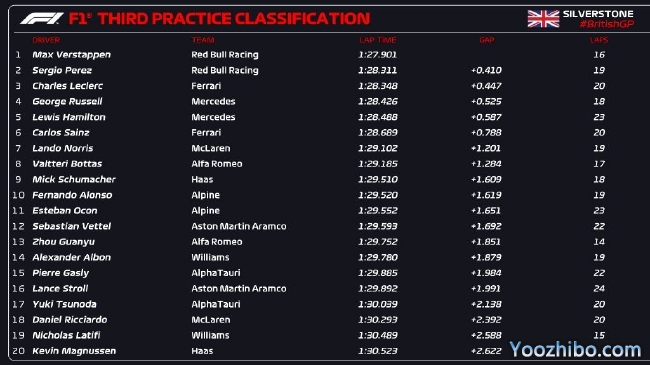 24直播网讯 2022年F1英国大奖赛第3次练习赛在银石赛道结束,红牛车队维斯塔潘1:27.901取得三练头名,他的队友佩雷兹第二落后0.410秒,法拉利车队勒克莱尔第三,他落后维斯塔潘0.447秒。两位梅赛德斯车手拉塞尔和汉密尔顿位列四五,第六至第十位分别是:塞恩斯、诺里斯、博塔斯、米克·舒马赫和阿隆索。