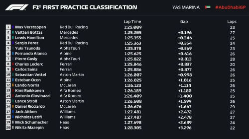 24直播网讯 北京时间12月10日晚上9点,2021赛季F1终于迎来了收官战阿布扎比大奖赛,在首日练习赛中,维斯塔潘在一练跑出1:25.009的成绩领先所有人,汉密尔顿落后超过0.3秒。