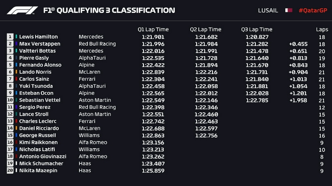 2021F1卡塔尔大奖赛排位赛成绩表: