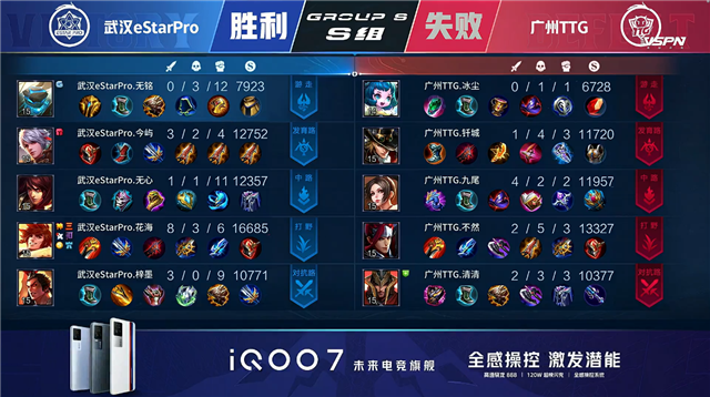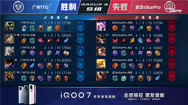 双方常规开局,2分21秒武汉ES中路击杀周瑜拿到一血。2分38秒武汉ES拿下暴君。4分52秒武汉ES上路击杀盾山。6分23秒武汉ES拿下主宰。6分59秒广州TTG拿下暴君,团战武汉ES击杀盾山。7分55秒广州TTG摧毁敌方上路外塔。9分16秒中路团战武汉ES击杀盾山。10分27秒广州TTG抢到暗影暴君,团战双方1换1。11分38秒广州TTG摧毁敌方下路二塔。13分24秒广州TTG摧毁敌方中路二塔。13分50秒广州TTG摧毁敌方上路高地塔。15分55秒广州TTG摧毁敌方水晶拿下比赛。