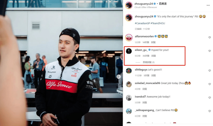 周冠宇在社交媒体上表示希望P8是美妙旅程的开始,很显然他对于接下来的比赛也很有信心和期待值。很快中国滑雪金牌运动员谷爱凌就评论,为周冠宇加油祝福,两人上演梦幻联动时刻。