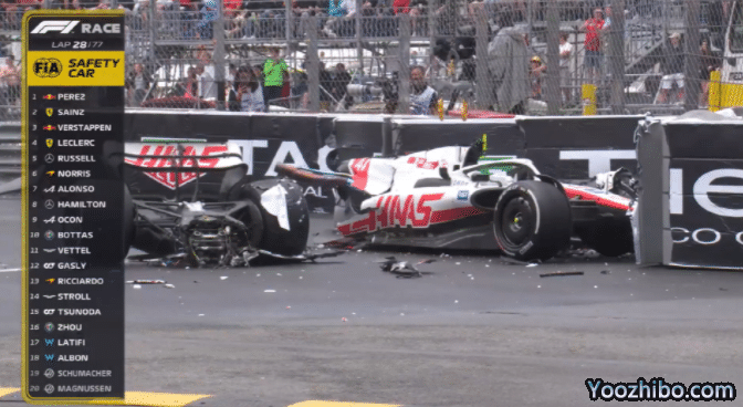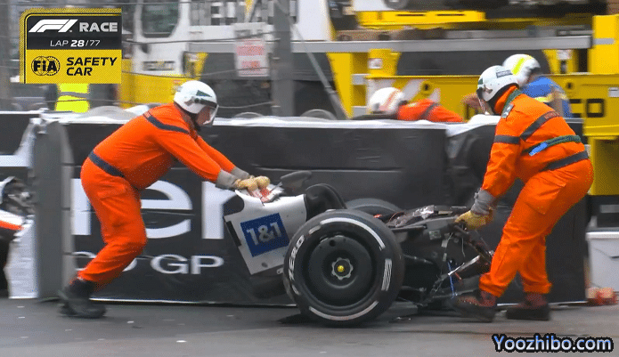 比赛第29圈,传奇车王舒马赫之子米克-舒马赫在追击周冠宇的时候打滑撞车,慢镜头显示,身前就是周冠宇,米克-舒马赫想要驾驶打滑遭遇严重撞车,车身后半段尾翼断裂,现场碎渣有很多,安全车出动。由于现场要维修护墙,所以比赛出示红旗中断,所有赛车回到维修区。