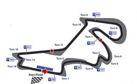 “首先从主看台下面的大直道全速通过,当到达第一个左弯前刹车时车速为每小时300公里左右。1号弯呈90度,而且带有明显的下坡特征。我们可以使用三档以大约每小时160公里的速度通过。其实1号弯和2号弯是一个组合弯道,使出向右的2号弯时速度已经可以上升到每小时200公里。