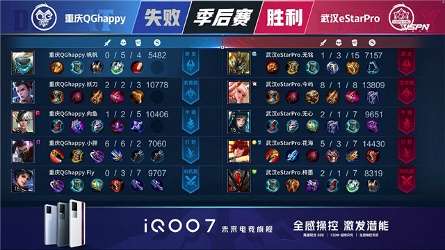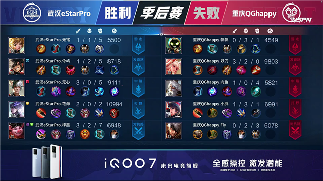 1分40秒武汉eStar裴擒虎击杀兰陵王拿下一血,2分05秒团战重庆QG打出1换2,重庆QG拿下暴君。4分钟双方互换上路一塔,5分21秒武汉eStar打出0换2。5分46秒重庆QG击杀西施,拆掉武汉eStar上路一塔。6分16秒团战双方1换1,8分56秒团战武汉eStar打出2换3,9分10秒武汉eStar击杀狄仁杰,拆掉重庆QG中路一塔。10分38秒重庆QG拿下暗影主宰,武汉eStar拿下暗影暴君。11分08秒武汉eStar击杀盾山,11分38秒武汉eStar打出1换2,拆掉重庆QG中路二塔。13分12秒武汉eStar击杀兰陵王,13分29秒武汉eStar击杀曜。15分45秒武汉eStar击杀盾山,16分13秒武汉eStar拆掉重庆QG中路高地,带领兵线强拆水晶拿下胜利。