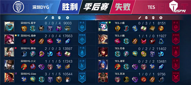 开局TES入侵野区,周瑜拿下一血。1分钟不知火舞击杀公孙离。2分30秒下路团战,TES打出1换2。4分40秒兰陵王推掉上路一塔。5分钟梦奇拿下主宰。5分40秒下路团战,双方1换1,小鹏公孙离推掉下路一塔。7分钟兰陵王拿下暴君。9分27秒兰陵王拿下主宰。10分15秒梦奇拿下主宰。11分钟小鹏公孙离推掉中路一塔。12分40秒兰陵王拿下暴君。13分25秒小鹏公孙离推掉下路二塔。14分30秒小鹏公孙离拿下主宰。15分10秒TES强攻中路二塔,双方1换1,TES推掉中路二塔。15分55秒兰陵王被击杀。16分50秒下路团战,TES打出1换2。17分20秒兰陵王拿下暴君。18分10秒吕布被击杀。19分10秒兰陵王拿下主宰。19分40秒深圳DYG下路双人组被击杀。19分56秒深圳DYG下路高地塔被破。TES顺势强攻高地,团战双方来回拉扯将近1分钟,TES打出1换3。20分51秒TES攻破水晶拿下本局比赛胜利。