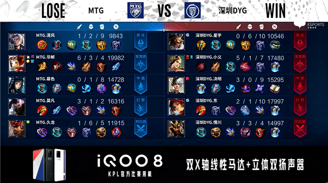 双方常规开局。2分10秒深圳DYG拿下主宰,MTG拿下暴君。3分30秒野区团战深圳DYG打出1换3,西施拿到三连决胜。4分57秒对抗路团战深圳DYG打出0换3。5分41秒深圳DYG野区打出0换2。5分59秒深圳DYG摧毁敌方对抗路二塔。7分36秒深圳DYG对抗路打出0换2。7分54秒深圳DYG摧毁敌方中路外塔。8分30秒深圳DYG抢到主宰。8分55秒深圳DYG摧毁敌方中路二塔。9分05秒深圳DYG摧毁敌方发育路二塔。10分21秒深圳DYG拿下暗影暴君。10分52秒深圳DYG拿下暗影主宰。12分31秒深圳DYG发育路击杀公孙离。12分59秒高地团战双方1换1,深圳DYG摧毁敌方中路、发育路高地塔。14分23秒中路团战MTG打出0换3。15分38秒MTG对抗路击杀娜可露露。17分56秒野区团战MTG打出0换2。20分20秒发育路团战MTG打出2换4,庄周拿到三连决胜。20分57秒MTG发育路击杀廉颇。21分39秒MTG拿下风暴龙王。24分12秒中路团战MTG打出3换4。26分30秒MTG拿下风暴龙王,深圳DYG打出1换2。28分37秒MTG摧毁敌方水晶拿下比赛。