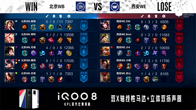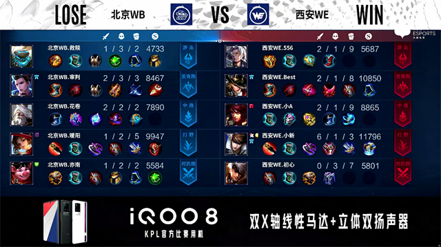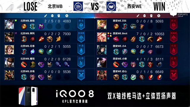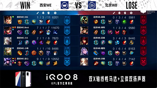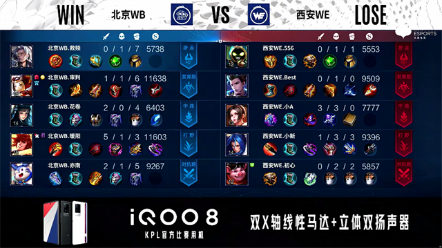 2分钟,上路团,西安WE打出0换2。2分23秒,西安WE控下先知主宰。4分13秒,西安WE控下暴君。4分35秒,西安WE破掉北京WB下一塔。5分33秒,西安WE破掉北京WB中一塔。6分27秒,西安WE破掉北京WB下二塔。7分钟,野区团,西安WE打出1换5团灭对手并破掉北京WB上二塔,马超拿下三杀。8分20秒,西安WE击杀老夫子并破掉北京WB中二塔,9分30秒,西安WE中路击杀露娜。10分11秒,西安WE控下暗影暴君。10分36秒,下路团,西安WE打出2换3。11分06秒,西安WE破掉北京WB中高地并打出1换2。11分54秒,西安WE拿下暗影主宰。12分28秒,西安WE破掉北京WB下高地。12分53秒,西安WE破掉北京WB上高地。13分35秒,高地团,西安WE打出2换5团灭对手,李元芳拿下四杀。13分51秒,西安WE摧毁北京WB水晶率先拿到赛点。