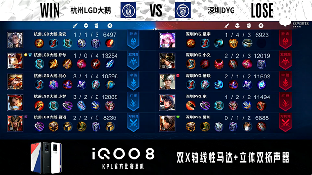 开局深圳DYG入侵野区未果。1分04秒杭州LGD大鹅主宰处击杀梦奇拿到一血。3分整深圳DYG拿下暴君。4分48秒杭州LGD大鹅拿下主宰,中路团战杭州LGD大鹅打出1换2。6分15秒深圳DYG摧毁敌方对抗路外塔。7分26秒中路团战深圳DYG击杀盾山。8分04秒杭州LGD大鹅发育路击杀梦奇。9分38秒深圳DYG摧毁敌方对抗路二塔。9分47秒主宰处团战双方1换1。10分39秒深圳DYG拿下暗影暴君。11分29秒杭州LGD大鹅野区击杀太乙真人。11分39秒双方中路1换1。13分42秒深圳DYG中路击杀盾山。13分58秒中路团战双方3换3。14分33秒深圳DYG摧毁敌方中路二塔。15分26秒深圳DYG拿下暗影暴君。16分25秒杭州LGD大鹅中路击杀橘右京。17分07秒中路团战杭州LGD大鹅打出0换3。18分03秒高地团战双方1换1,杭州LGD大鹅摧毁敌方对抗路高地塔。20分16秒杭州LGD大鹅拿下风暴龙王。20分25秒对抗路团战双方3换3。22分30秒野区团战杭州LGD大鹅打出1换4。22分59秒杭州LGD大鹅摧毁敌方水晶拿下比赛。