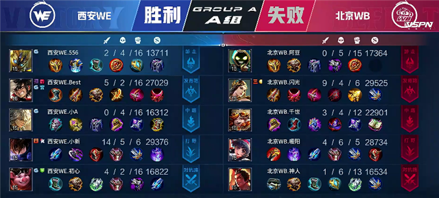 开局北京WB换线,廉颇走中路,公孙离走上路。1分10秒野区团战,公孙离拿到一血,团战中西安WE打出1换2。2分30秒西安WE拿下暴君。2分55秒老夫子在下路被击杀。4分10秒不知火舞被击杀。4分40秒西安WE推掉上路一塔。6分16秒北京WB强推下路一塔,团战西安WE打出1换4。6分50秒西安WE推掉中路一塔。7分25秒裴擒虎拿下暴君。7分36秒下路团战,马可波罗被击杀。8分10秒中路团战,双方打出1换1。9分钟西安WE入侵野区,赵云被击杀。9分43秒西安WE推掉上路二塔。10分17秒裴擒虎拿下暴君。10分47秒西安WE推掉下路二塔。11分46秒裴擒虎推掉中路二塔。12分15秒野区团战,西安WE打出1换2。12分48秒北京WB中路高地塔被破。13分35秒裴擒虎拿下主宰。14分钟野区团战,北京WB打出0换4,公孙离拿下双杀,西安WE推掉下路高地塔。14分41秒赵云拿下暴君。15分钟北京WB推掉中路一塔。17分30秒中路河道团战,西安WE团灭北京WB,裴擒虎拿下双杀。18分07秒西安WE攻破水晶拿下本场比赛胜利。