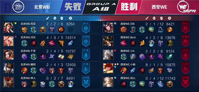 双方平稳开局。56秒马超拿下一血。2分20秒北京WB拿下暴君。2分57秒周瑜在上河道被击杀。3分40秒上路团战,北京WB打出0换2。4分15秒兰陵王拿下主宰。5分钟兰陵王越塔击杀马超。5分46秒西安WE推掉上路一塔,同时鲁班七号推掉下路一塔。5分51秒中路团战,兰陵王被击杀,西安WE推掉中路一塔。6分30秒西施在下河道被击杀。6分49秒鲁班七号拿下暴君。8分钟鲁班七号推掉上路一塔。8分30秒阿古朵拿下主宰。9分57秒河道团战,西安WE打出0换2,阿古朵拿下双杀。10分36秒西安WE拿下暴君。12分20秒下路团战,西安WE打出2换3,阿古朵拿下双杀。13分钟西安WE下路二塔被破。17分20秒野区团战,兰陵王被击杀。17分40秒西安WE推掉中路二塔。17分55秒虞姬拿下暴君。18分10秒野区团战,鲁班七号被击杀。19分20秒西安WE拿下主宰。20分钟中路团战,西安WE打出1换4,阿古朵拿下双杀。21分钟西安WE强推水晶率先拿到赛点。