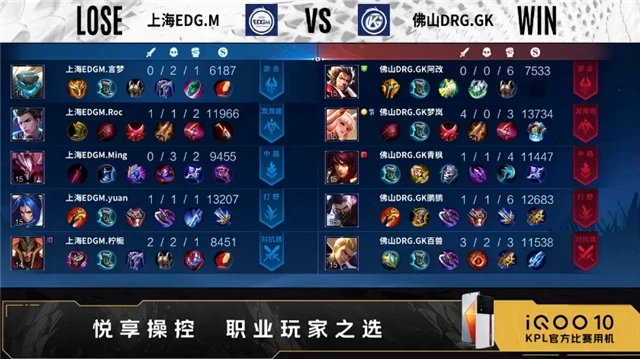 双方常规开局。2分51秒上海EDG.M拿下暴君。3分33秒佛山DRG.GK对抗路击杀夏侯惇拿到一血。4分39秒佛山DRG.GK对抗路打出0换3。5分15秒佛山DRG.GK摧毁敌方对抗路外塔。5分20秒佛山DRG.GK拿下主宰。6分26秒发育路团战佛山DRG.GK打出1换3。6分50秒佛山DRG.GK摧毁敌方中路外塔。7分57秒发育路团战佛山DRG.GK击杀周瑜。9分46秒佛山DRG.GK拿下主宰。11分32秒佛山DRG.GK拿下暗影暴君。11分59秒高地团战佛山DRG.GK团灭对手摧毁水晶拿下比赛。