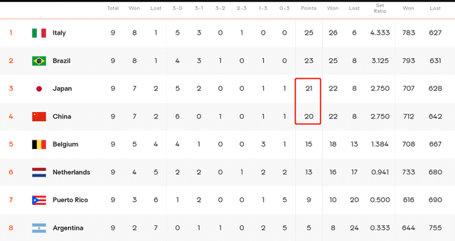 在E组最终的积分榜上,意大利和巴西早早锁定前两位。日本女排和中国女排同为7胜2负,也都是胜22局输8局。但由于中国女排只有6场3-0和3-1的胜利,而日本女排则有7场,在积分上日本女排21分,中国女排20分,日本女排最终排名小组第三对阵巴西,中国女排排名第四对阵意大利。