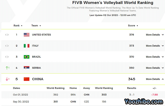 输给巴西队,中国女排减少了7.88分,再加上塞尔维亚女排3-0横扫美国队,积分增加15分,使得中国女排的世界排名下降到了第5位。此前一直是第四名,距离巴西之间的差距并不大,但在硬碰硬的比赛中被对手逆转,使得中国女排被塞尔维亚反超,排名下降。