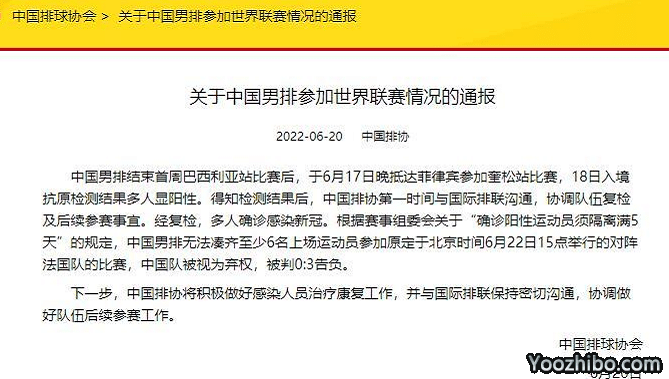 按照中国排协此前的通报显示,全队在结束了巴西利亚站的4场比赛之后奔赴菲律宾参赛,结果17日晚抵达,18日检测就显示有多人确诊,经复检之后又是多人确诊。组委会的规定是“确诊阳性运动员须隔离满5天”,所以中国男排对阵法国队的比赛被取消,判罚中国男排0-3输球。这次中国男排多人康复,检测也没有问题,所以赶上了与德国队的比赛。