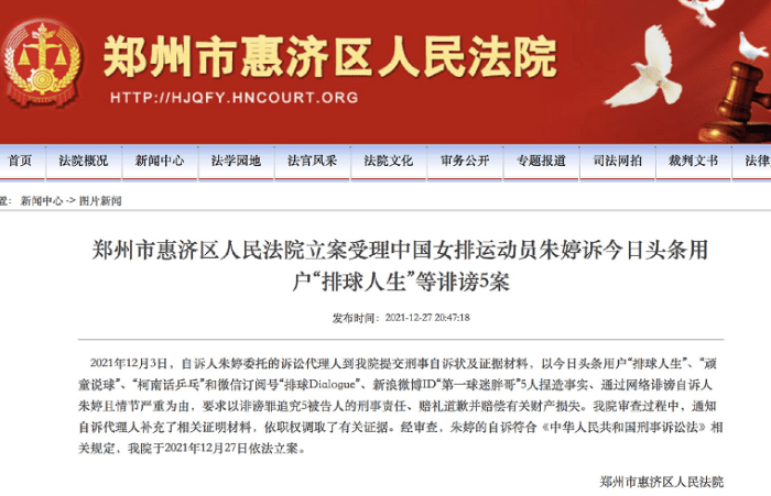 来源:24直播网12-28 10:4024直播网12月28日讯 近日中国女排队长朱婷维权的事情吸引了很多人的关注,有5名网友、自媒体在针对进行造谣。其实朱婷在8月11日就报警了,到了12月27日,朱婷的报警已经正式被立案受理,希望这些造谣者可以承担刑事责任、赔礼道歉并赔偿有关财产损失。这件事情一出,不少人表示朱婷的做法是对的,面对这些无中生有的造谣者,就是需要拿起法律的武器来维权。