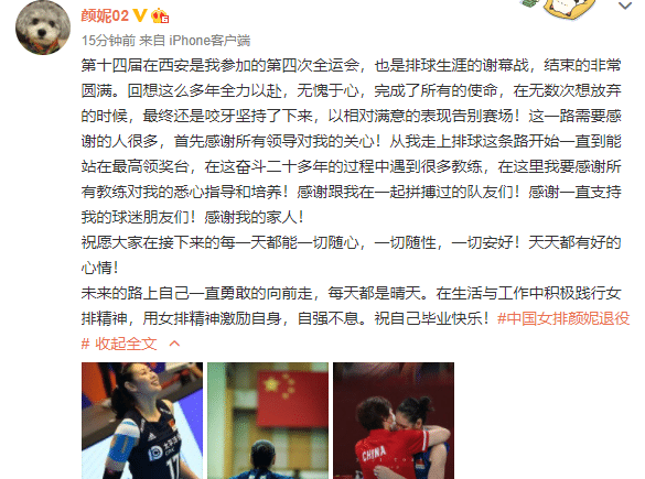 颜妮还配上了几张自己与郎平、国旗一起的照片,这是她的恩师,也是为之努力的目标。在结束了全运会之后,颜妮也正式结束了自己的职业生涯,无愧无心,职业生涯中带伤出战中国女排的比赛,是无数人的偶像。