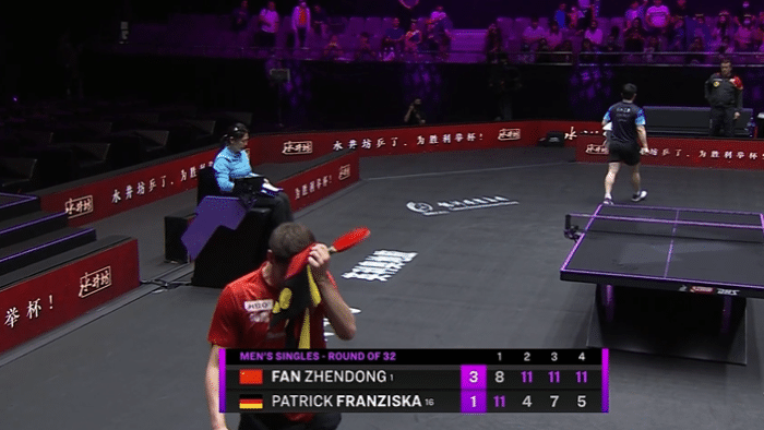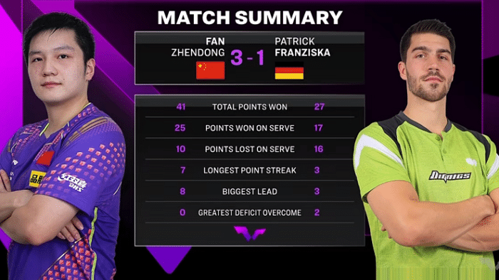 第一节樊振东在8平之后连丢3分,以8-11不敌对手,弗朗西斯卡的状态确实很好。第二局樊振东强势反弹,7-0开局,以11-4拿下。第三局,樊振东开局不错,连得5分,但接发球还是有些问题,弗朗西斯卡一度追至5-7。樊振东稳定住局面,连续得分,以11-7再下一城。第四局,樊振东中远台对拉相当精彩,这一局,樊振东以11-5拿下,大比分3-1逆转击败德国名将弗朗西斯卡。