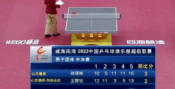 第一盘山东鲁能拿下,王楚钦出战第二盘,他的对手是徐瑛彬,比赛期间王楚钦开局打得很好,12-10和11-5连赢两局,大比分2-0领先,看到赢球的希望。没想到的是接下来的两局,王楚钦加起来只得到了8分,以3-11和5-11被徐瑛彬拖入到决胜局。到了决胜局的较量,王楚钦一度占优,但还是在关键时刻崩盘,打到延长分之后以13-15输掉决胜局,大比分2-3被徐瑛彬逆转击败。