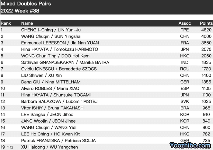 双打方面,女双第一依旧是“海产姐妹花”王曼昱和孙颖莎。男双的樊振东/王楚钦第三、林高远/梁靖崑第七。混双的刘诗雯和许昕虽然逐渐淡出中国队,但他们依旧以1400分位居混双世界第八。