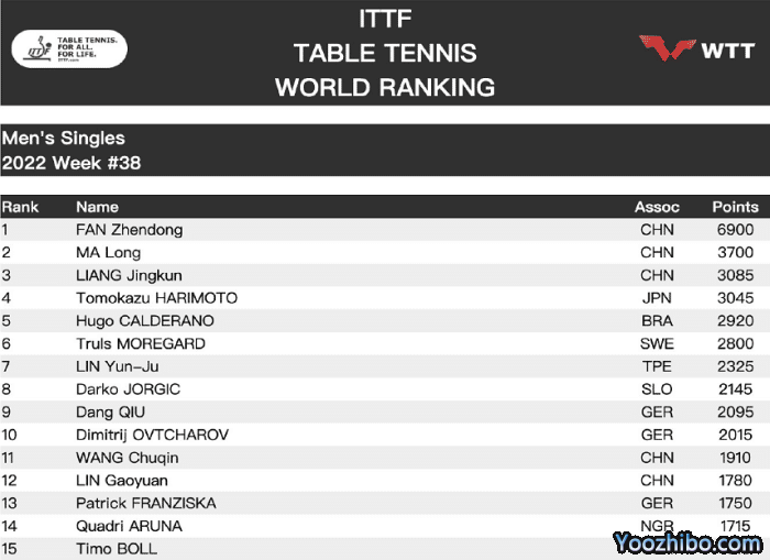 男单层面,世界前三名都被中国队占据,第一名是樊振东,6900分优势巨大。第二名是马龙、第三名梁靖崑。张本智和、雨果·卡尔德拉诺位居第四和第五名。相比起女单,国乒的男单优势并不算太大,但樊振东还是具备绝对的统治力,他也是目前男单的绝对霸主。