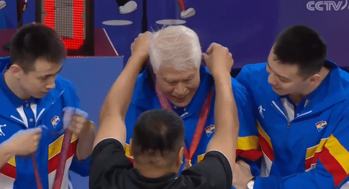 辽宁队这边全员则是微笑挂在脸上,尤其是张镇麟,这是小伙子拿到的第一块金牌,拿着端详了很久,而到教练员这边,杨鸣让刘玉栋给蒋兴权戴上,蒋老推辞了好久最后戴上了,辽篮这批小伙子都是在他的注视下长大的,80多岁了仍在跟着球队征战,值得我们点赞,祝福辽宁队!
