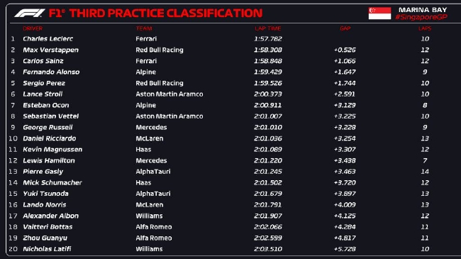 2022年F1新加坡大奖赛第3次练习赛成绩表: