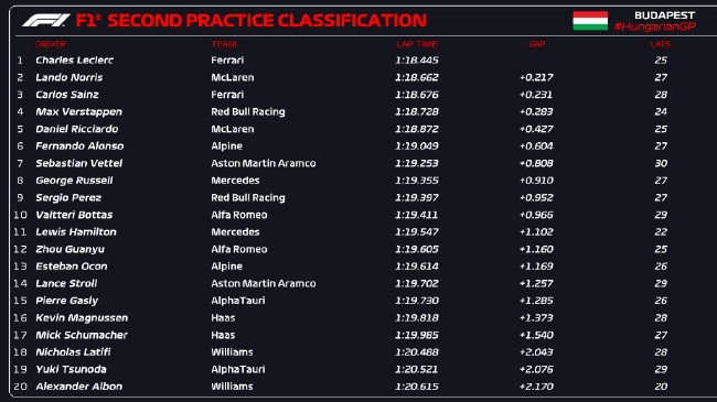 24直播网讯 2022年F1匈牙利大奖赛第2次练习赛在亨格罗宁赛道结束,法拉利车队勒克莱尔凭借1:18.445的单圈成绩拿到头名,迈凯伦车队诺里斯落后0.217排名第二,另一位法拉利车手塞恩斯第三。第四至第十分别是:维斯塔潘、里卡多、阿隆索、维特尔、拉塞尔、佩雷兹、博塔斯。中国车手周冠宇第12。
