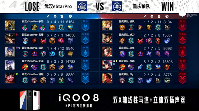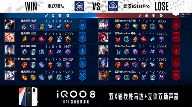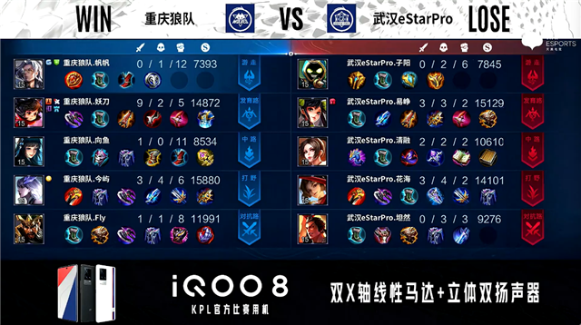 双方常规开局。3分11秒暴君处团战重庆狼队打出2换3,重庆狼队不知火舞拿到一血。4分04秒重庆狼队发育路越塔击杀马可波罗。4分23秒重庆狼队野区击杀弈星。4分37秒重庆狼队摧毁敌方对抗路、发育路外塔。5分14秒武汉eStar对抗路击杀不知火舞。6分24秒重庆狼队拿下主宰。6分37秒武汉eStar中路击杀不知火舞。8分09秒重庆狼队拿下暴君。8分54秒野区团战重庆狼队打出2换4。9分20秒重庆狼队摧毁敌方中路外塔。9分42秒对抗路双方1换1。10分18秒重庆狼队摧毁敌方对抗路二塔。10分34秒重庆狼队拿下暗影暴君。11分02秒重庆狼队野区击杀弈星。11分38秒重庆狼队摧毁敌方发育路高地塔。13分14秒重庆狼队拿下暗影主宰。13分58秒重庆狼队摧毁敌方中路高地塔,武汉eStar击杀吕布。14分41秒野区团战双方2换2。14分58秒武汉eStar野区击杀蒙犽。15分18秒武汉eStar拿下暗影暴君。16分16秒中路双方1换1。16分26秒武汉eStar野区打出0换2。17分09秒武汉eStar摧毁敌方中路、对抗路二塔。17分39秒重庆狼队野区击杀镜。18分25秒重庆狼队强点水晶拿下比赛。