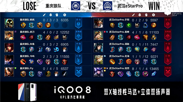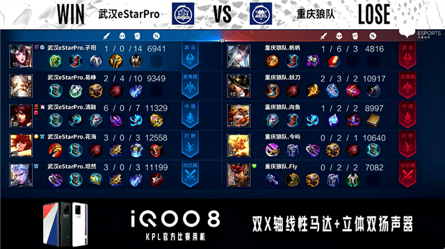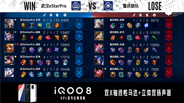 开局武汉eStar中路橘右京击杀兰陵王拿到一血。1分钟重庆狼队边路分别击杀廉颇、不知火舞。2分08秒重庆狼队拿下暴君。3分02秒发育路团战武汉eStar打出1换3。3分46秒重庆狼队主宰处打出1换2并拿下主宰。6分37秒武汉eStar拿下暴君。7分11秒武汉eStar野区击杀橘右京。8分20秒重庆狼队野区击杀公孙离。8分45秒武汉eStar抢到主宰。9分20秒武汉eStar中路击杀不知火舞。9分39秒武汉eStar摧毁敌方中路二塔。10分46秒武汉eStar中路击杀兰陵王。11分07秒野区团战双方2换2。11分20秒重庆狼队中路击杀澜。11分57秒重庆狼队拿下暗影主宰。13分54秒重庆狼队摧毁敌方中路外塔。15分08秒重庆狼队拿下暗影暴君。15分40秒重庆狼队摧毁敌方发育路二塔。16分16秒武汉eStar野区击杀不知火舞。16分30秒武汉eStar拿下暗影主宰。16分57秒高地团战重庆狼队打出1换2。19分58秒野区团战双方2换2。20分40秒重庆狼队发育路打出0换2。21分20秒重庆狼队拿下风暴龙王。22分45秒中路团战武汉eStar打出0换3。24分46秒中路团战重庆狼队击杀澜。26分16秒武汉eStar中路击杀兰陵王。28分50秒中路团战重庆狼队打出0换2。29分20秒重庆狼队拿下风暴龙王。30分40秒武汉eStar高地击杀关羽,重庆狼队摧毁敌方中路高地塔。31分38秒武汉eStar摧毁敌方水晶拿下比赛。