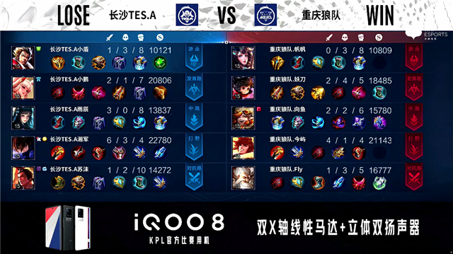 2分22秒,下路团,长沙TES.A打出1换2。3分35秒,重庆狼队下路击杀盾山,随后长沙TES.A安琪拉蹲草击杀太乙真人。5分20秒,长沙TES.A控下暴君。5分40秒,下路团,重庆狼队击杀盾山。8分23秒,长沙TES.A控下先知主宰。8分50秒,中路双方辅助互换。10分15秒,重庆狼队控下暗影主宰,随后击杀马可波罗。12分31秒,重庆狼队破掉长沙TES.A下二塔。14分40秒,重庆狼队控下暗影主宰。14分58秒,长沙TES.A破掉重庆狼队下二塔。16分15秒,重庆狼队破掉长沙TES.A中一塔。16分35秒,重庆狼队控下暗影暴君。17分47秒,重庆狼队破掉长沙TES.A上二塔。19分10秒,重庆狼队控下暗影主宰。20分13秒,重庆狼队击杀安琪拉。20分34秒,重庆狼队控下风暴龙王。21分15秒,重庆狼队破掉长沙TES.A中二塔。22分26秒,重庆狼队破掉长沙TES.A上高地。22分40秒,重庆狼队破掉长沙TES.A中高地。22分58秒,重庆狼队边团边拆摧毁长沙TES.A水晶赢下比赛。