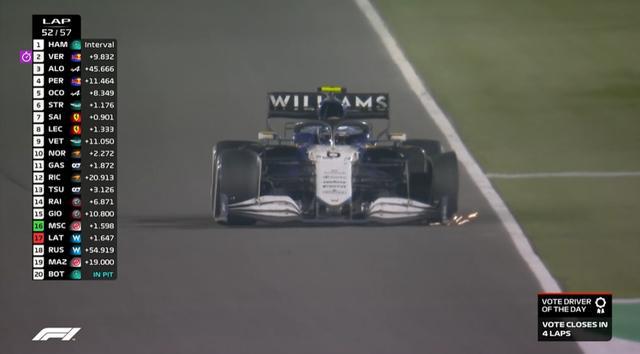 第47圈,佩雷兹超越斯托尔,来到第6位,并在下一圈过掉奥康,升至第5位,将继续向身前的诺里斯和阿隆索发起进攻。第51圈,博塔斯将赛车开回维修通道,选择退赛,拉塞尔的轮胎出现爆胎,进站更换轮胎。