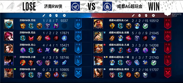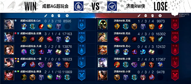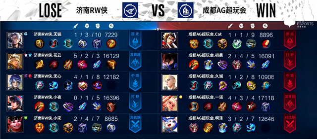 2分17秒娜可露露拿下暴君。3分39秒澜拿到主宰。4分10秒济南RW侠入侵野区,弈星拿下一血。6分25秒成都AG超玩会下路一塔被破。6分30秒梦奇被击杀。7分钟澜拿下暴君。8分钟澜推掉下路一塔。9分钟澜拿下主宰。9分40秒野区团战,济南RW侠打出1换2。10分31秒梦奇拿下主宰,团战济南RW侠打出1换2。10分50秒娜可露露拿下暴君。11分钟后羿推掉中路一塔。13分10秒公孙离被击杀。13分30秒济南RW侠强攻上路一塔,双方1换1。15分钟中路团战,双方2换2。16分钟澜拿下暴君,金蝉被击杀。16分50秒济南RW侠强攻中路高地塔,双方1换1。21分43秒澜拿下风暴龙王,团战成都AG超玩会打出1换3。22分25秒成都AG超玩会推掉水晶拿下本场比赛胜利。