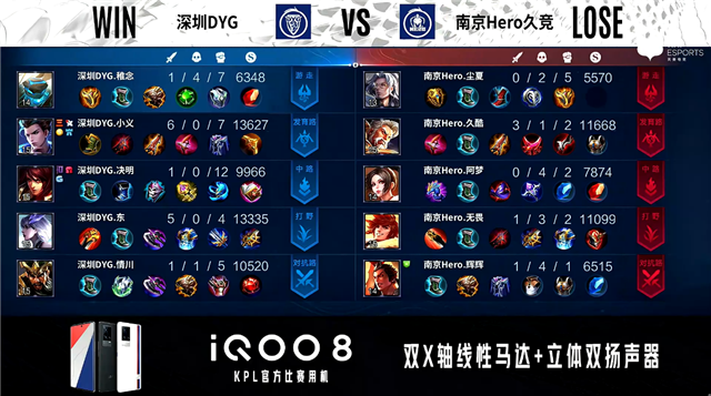 开局南京Hero吕布走中、不知火舞走对抗路。2分11秒深圳DYG拿下暴君。4分22秒南京Hero拿下主宰。5分22秒暴君处团战深圳DYG打出0换2。6分14秒深圳DYG野区击杀裴擒虎。6分36秒深圳DYG对抗路击杀鲁班大师。7分27秒南京Hero野区击杀盾山。8分28秒深圳DYG中路击杀不知火舞。8分54秒深圳DYG摧毁敌方中路二塔。9分02秒深圳DYG摧毁敌方发育路二塔。9分22秒深圳DYG发育路团战打出0换3。9分42秒深圳DYG摧毁敌方发育路高地塔,南京Hero击杀关羽。10分19秒南京Hero中路击杀盾山。10分39秒深圳DYG抢到暗影暴君。14分01秒对抗路团战双方1换1,深圳DYG摧毁敌方对抗路高地塔。16分33秒高地团战深圳DYG打出1换5,狄仁杰拿到三连决胜。16分49秒深圳DYG摧毁敌方水晶拿下比赛。