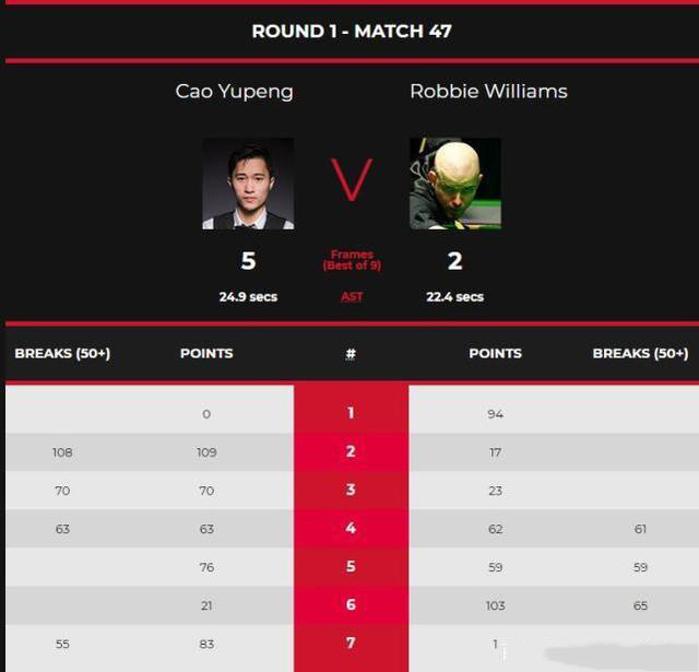 24直播网讯北京时间10月24日消息,2021斯诺克德国大师赛资格赛第一轮继续进行,一场焦点比赛中,中国名将曹宇鹏发挥出色,轰出一杆破百(108分)和三杆50+(70分、63分、55分),5-2战胜罗比-威廉姆斯,强势晋级资格赛第二轮。在曹宇鹏和罗比·威廉姆斯的比赛中,曹宇鹏同样表现出色。