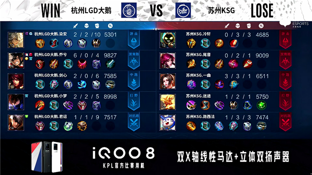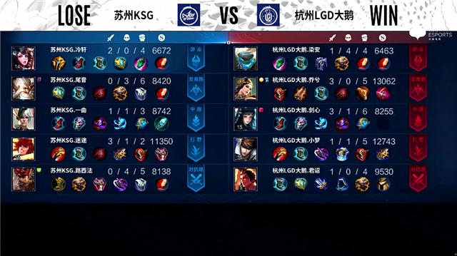 1分55秒,苏州KSG不知火舞上路击杀夏侯惇拿下一血。2分37秒,杭州LGD大鹅控下暴君。3分27秒,杭州LGD大鹅破掉苏州KSG下一塔。3分42秒,苏州KSG团战击杀张良。4分26秒,苏州KSG控下先知主宰。5分18秒,杭州LGD大鹅破掉苏州KSG上一塔。5分59秒,杭州LGD大鹅破掉苏州KSG中一塔。6分49秒,杭州LGD大鹅控下暴君。7分43秒,双方团战1换1。8分01秒,杭州LGD大鹅追击再次击杀敌方两人。9分38秒,杭州LGD大鹅破掉苏州KSG中二塔。10分10秒,中路团,杭州LGD大鹅打出0换3。10分33秒,杭州LGD大鹅破掉苏州KSG中高地,随后团战杭州LGD大鹅打出1换2。10分57秒,杭州LGD大鹅破掉苏州KSG下高地。11分45秒,杭州LGD大鹅控下暗影暴君。12分11秒,双方团,杭州LGD大鹅打出1换5团灭对手。12分36秒,杭州LGD大鹅摧毁苏州KSG水晶赢下比赛。