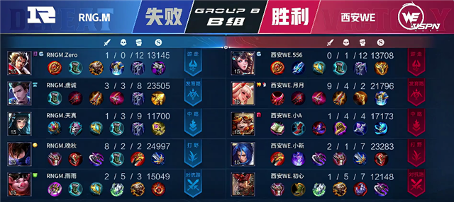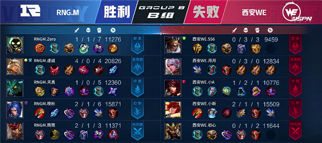 双方和平开局。1分钟下河道交火,镜拿下一血。1分20秒娜可露露入侵野区,镜被击杀。2分10秒RNG.M拿下暴君。3分40秒RNG.M拿下主宰。4分钟下路团战,镜拿下三杀,团战西安WE打出1换3。5分20秒娜可露露反下蓝Buff。5分40秒RNG.M越塔强杀白起,双方互换边路一塔。6分30秒RNG.M拿下暴君。6分50秒虞姬推掉下路一塔。8分10秒RNG.M推掉上路二塔。9分08秒RNG.M拿下主宰。10分钟RNG.M推掉中路一塔。10分20秒娜可露露拿下暴君。11分11秒西安WE中路二塔被破。12分钟RNG.M拿下主宰。14分35秒娜可露露拿下暴君。15分14秒RNG.M推掉上路高地塔。16分40秒娜可露露拿下主宰。17分44秒RNG.M推掉中路高地塔,盾山被击杀。17分56秒RNG.M攻破水晶拿下本场比赛胜利。