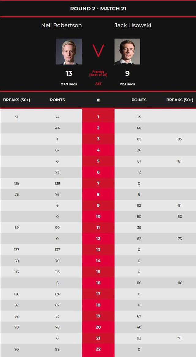 第21局,利索夫斯基背水一战,单杆得到71分以92-0追上一个赛点。第22局,罗伯逊没有再给对手留机会,上手后一杆90分,以99-0零封锁定胜局。最终,罗伯逊总比分13-9淘汰利索夫斯基。