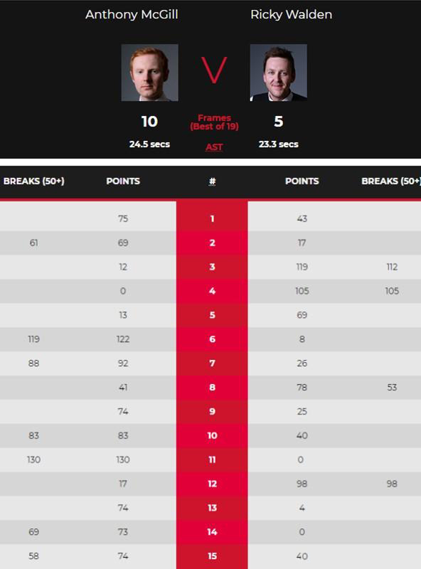 第14局,麦克吉尔单杆69分,以73-0拿下。麦克吉尔9-5赛点。第15局,麦克吉尔单杆58分以59-0领先,沃顿单杆36分,麦克吉尔抓住机会单杆7分超分,麦克吉尔最终74-30拿下了比赛。