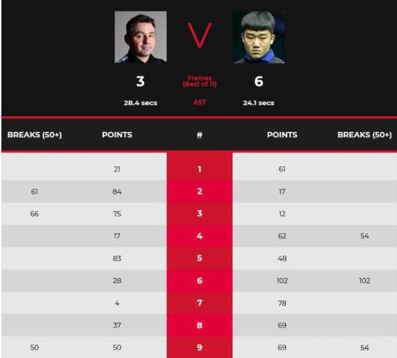 此后,白朗宁开始发威,他先是在第六局轰出了单杆102分一杆制胜,以102-28将大比分扳成3-3,随后又以78-4和69-37连下2局,大比分5-3拿到赛点。第9局,白朗宁轰出单杆54分,并通过多次上手以69-50赢下关键一局,大比分6-3获胜。